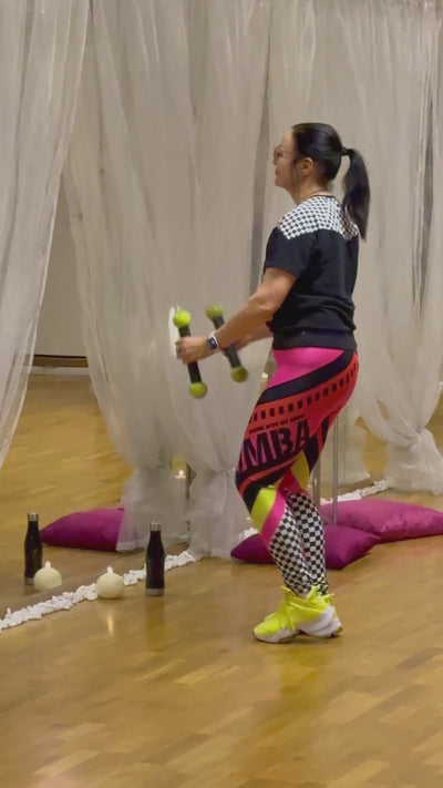 Vi börjar med klassisk Zumba och går över i Zumba® Toning – där latinsk musik blandas med toningövningar för armar, bål och hela kroppen. Toning sticks finns att låna på plats och hjälper dig träna effektivt med extra förbränning.